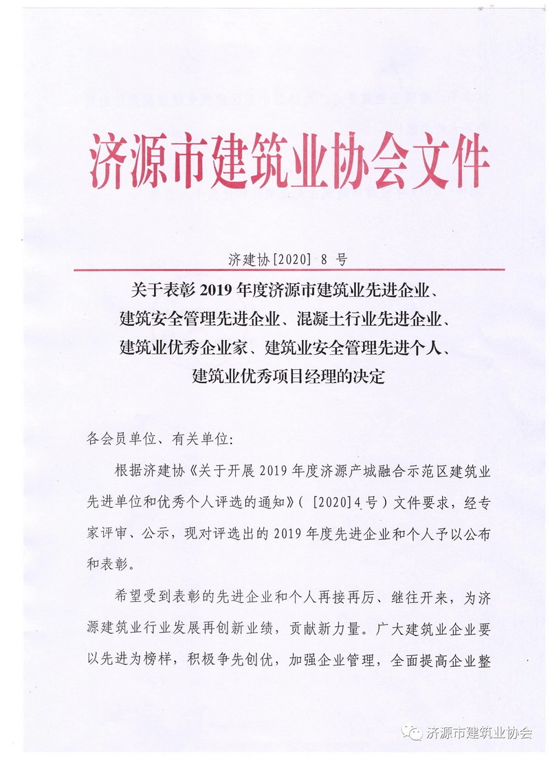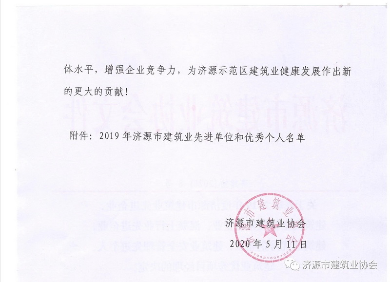 近日,濟(jì)源市建筑業(yè)協(xié)會(huì)開展了2019年度濟(jì)源產(chǎn)城融合示范區(qū)建筑業(yè)先進(jìn)單位和***個(gè)人的評(píng)選活動(dòng),明珠建設(shè)在評(píng)選活動(dòng)中脫穎而出,均斬獲佳績(jī)。